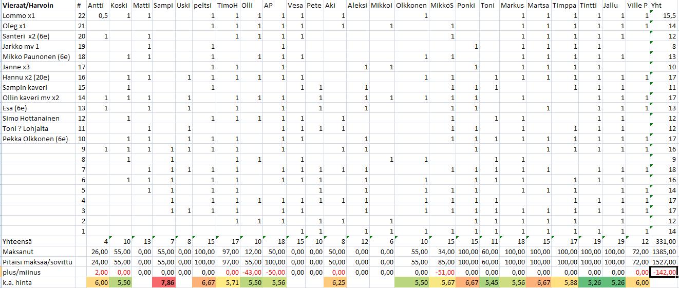 Syksy 2024 jälkeinen taloustilanne (05.01.2025): Maksut Huhtariin 15*70=1050e. Palaajamaksut 1183e. Kauden tulos 133e voitollinen. Kokonaisuudessaan ollaan minusta n. 380e miinuksella kun huomioidaan hyvät.